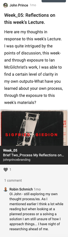 This week’s Lecture was, generally, insightful and introduced me to a number of ideas which I found to be educational and thought-provoking-specifically in regards to my own methodologies and practices. The content itself, was rich and led me to inquire further into the subjects that were discussed. Specifically, I was greatly interested in the work of Psychiatrist, Writer, and former Oxford scholar Ian McGilchrist and his exploration of the dividing of the brain. Having no prior knowledge of Ian’s work, I found the short-film to be enlightening and instructive, with easily digestible segments that allowed for pause and consideration.
